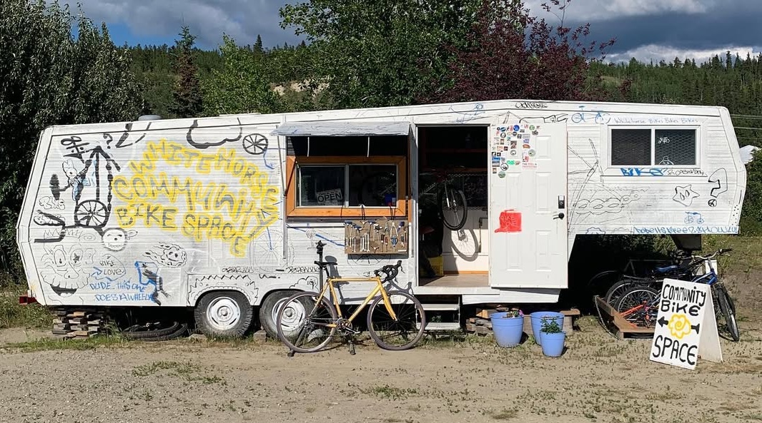 Chainwhip aka the Whitehorse Community Bike Space is a volunteer run drop in bike shop operating on Kwanlin Dün First Nation land in a repurposed trailer. The space has been running in this location since 2022 during the warmer months of the year. Additionally Chainwhip runs workshops, pop-ups in communities around the Yukon.